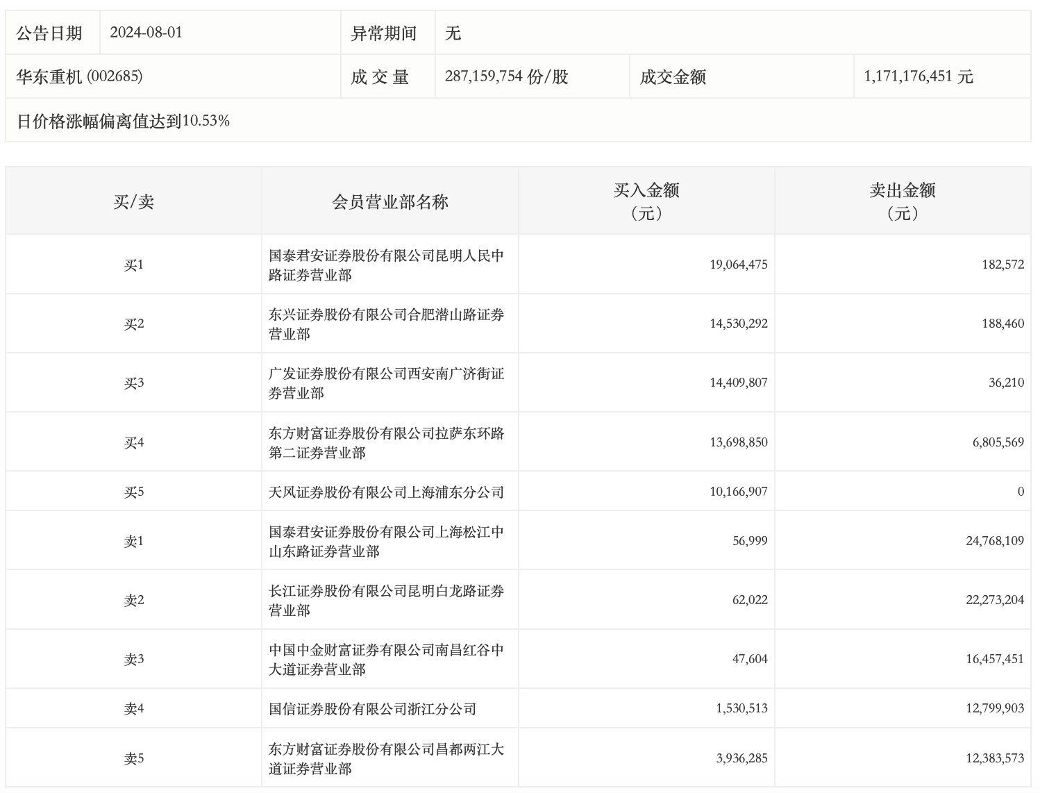 8月1日,华东重机今日涨停,龙虎榜数据显示,上榜营业部席位全天成交1.73亿元,占当日总成交金额比例为14.81%。其中,买入金额为7750.38万元,卖出金额为9589.51万元,合计净卖出1839.13万元。