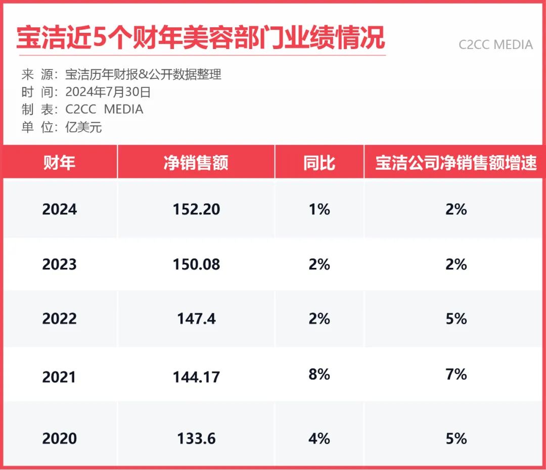 把时间线拉长,C2CC传媒梳理发现,宝洁美容业务近5年来仅维持个位数增长,2022年之前,美容业务增速尚能跑赢集团增速,但从2022年开始,增速均在集团增速之下或持平。
