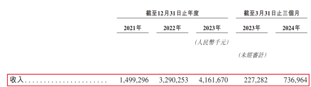 招股书显示,2021年至2024年3月(以下简称:报告期),其收入分别为14.99亿元、32.90亿元、41.62亿元、7.37亿元。