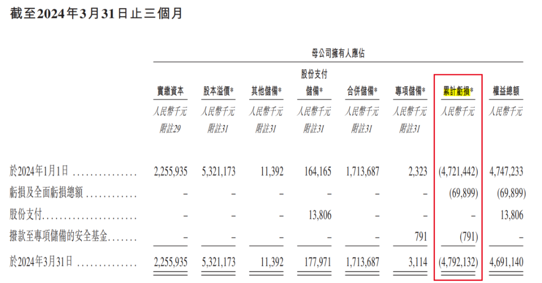 多年的亏损将正力新能的累计亏损额推至高位。招股书显示,截至2024年3月31日,母公司拥有人应占累计亏损高达47.92亿元。