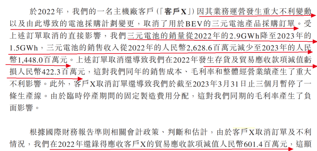 2022年,客户X因其业务运营发生重大不利变动以及由此导致的电池采购计划变更,取消了用于BEV的三元电池产品采购订单。