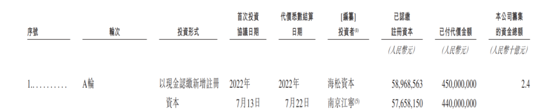 其中,A轮融资是在2022年7月,投资方包括海松资本、中金上汽产投、厦门国贸、建发产投等,募集资金24亿元。