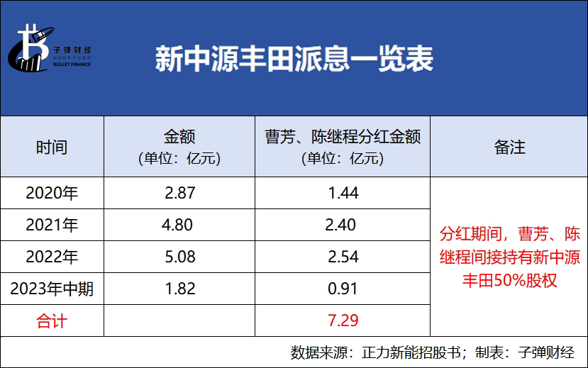 而在2020年至2022年,新中源丰田也曾分别派息2.87亿元、4.80亿元、5.08亿元,曹芳和陈继程也能拿走一半分红,约合6.38亿元。
