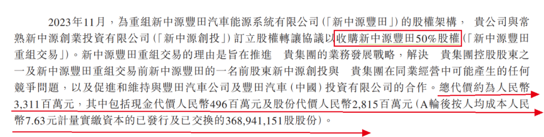 2023年11月,新中源创投向正力新能转让新中源丰田50%股权,套现33.11亿元。其中,现金代价4.96亿元、股份代价28.15亿元。