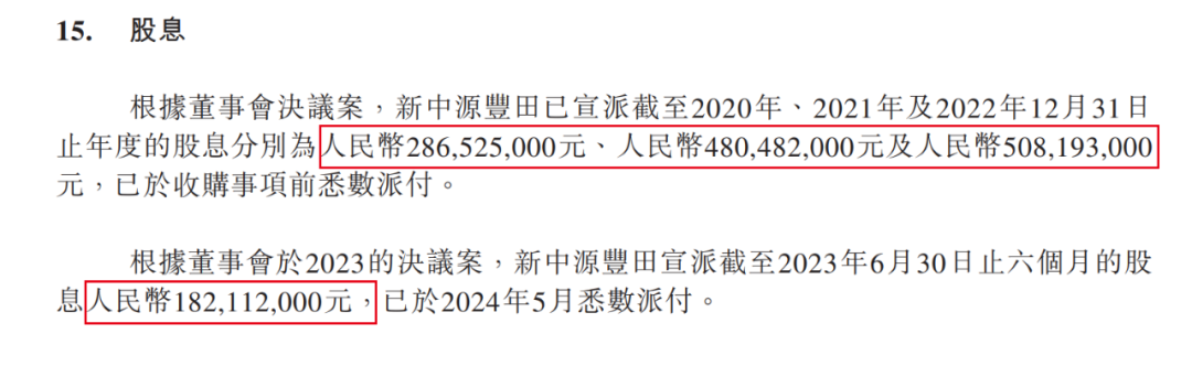 根据2023年决议案,新中源丰田宣派2023年中期股息1.82亿元,并赶在上市前夕的2024年5月悉数支付。作为间接持有50%股权的曹芳和陈继程,可以分走0.91亿元。