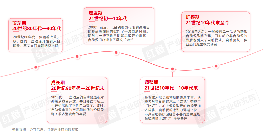 自助餐这一用餐形式起源于欧洲,约20世纪八九年代在我国开始流行。自助餐赛道曾经在高端自助品牌金钱豹的引领下进入爆发期,而后随着大量自助餐门店经营不善而陷入了调整和转型阶段。