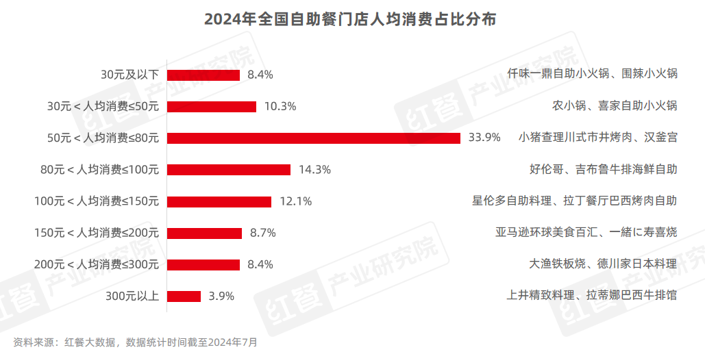 由于自助餐涵盖了众多品类,品牌定位也不尽相同,因此,其人均消费呈现出较大的跨度,既有30元以下的亲民价位,也有超过300元的高端选择,可满足不同消费者的需求。