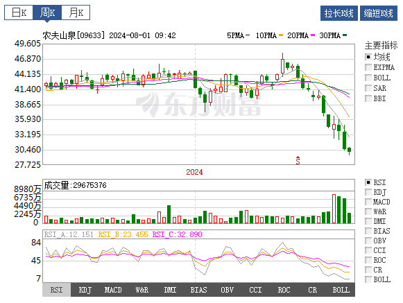 7月24日,农夫山泉股价大跌7.1%,收报30.75港元/股,已无限接近上市以来的历史低位。并且到25日收盘,也只是又涨回来了0.33%。