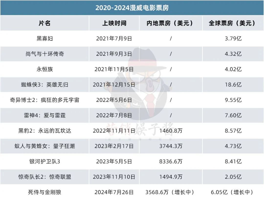 《复联4》为超级英雄电影的繁荣时代画上了句号,巅峰过后便只余下坡路。2020年和2021年间,漫威接连几部电影都未能被大陆引进,再加上全球受到疫情影响,电影产出削减,漫威仿佛一时间放弃了将重点放在中国内地市场这个全球第二大票仓上。