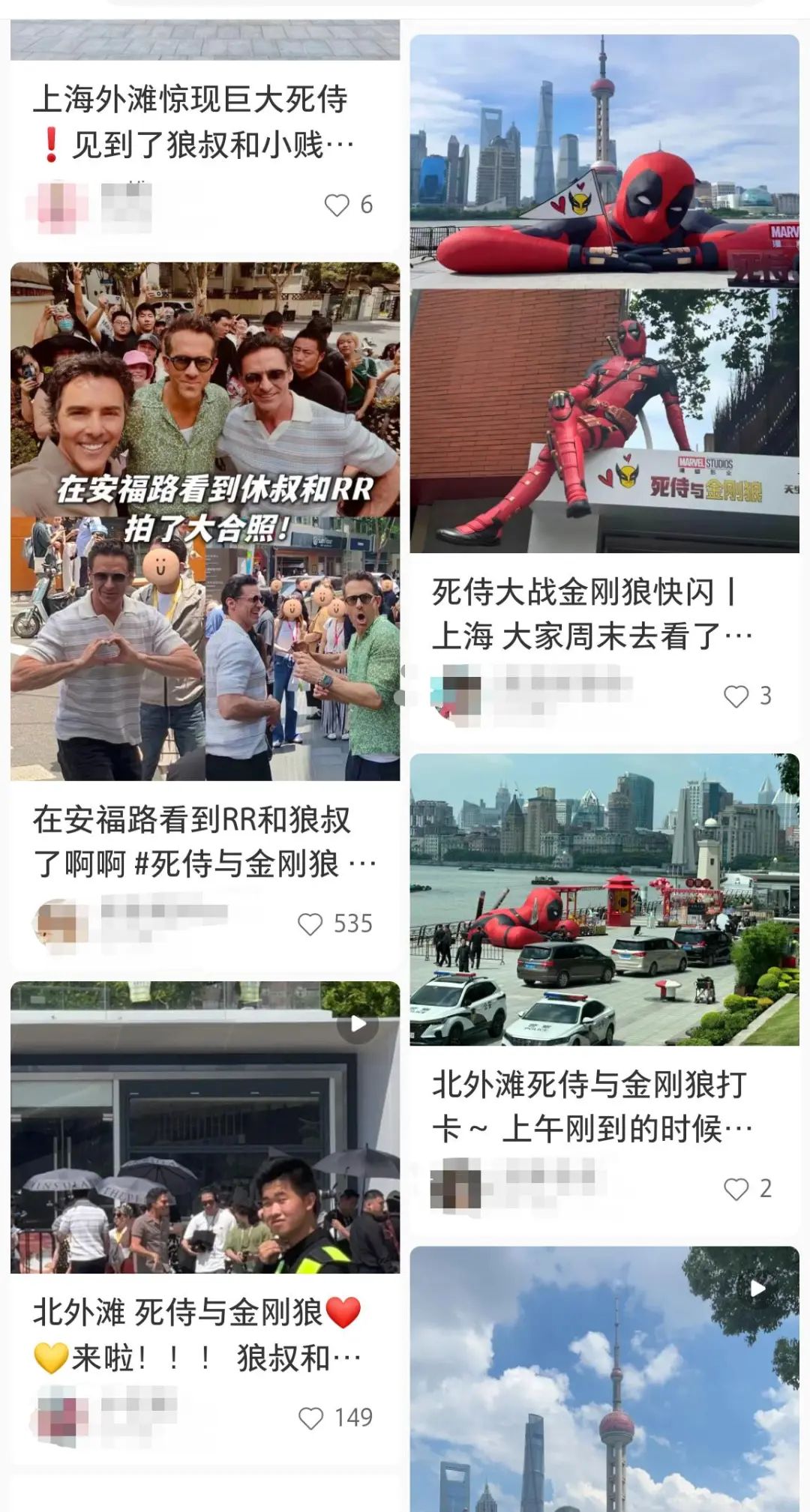 除了首映礼,“贱狼”组合的内地宣传期还包含了一系列为影片造势的活动。7日2日,首映礼当天,上海北外滩便放置了死侍角色的大型装置,吸引了不少游客和等候已久的漫威粉丝前去打卡;7月3日,两位主演亲自去到打卡现场,用中文和中国粉丝打招呼。很快,网上就有网友晒出了在上海安福路偶遇休和瑞安的照片。