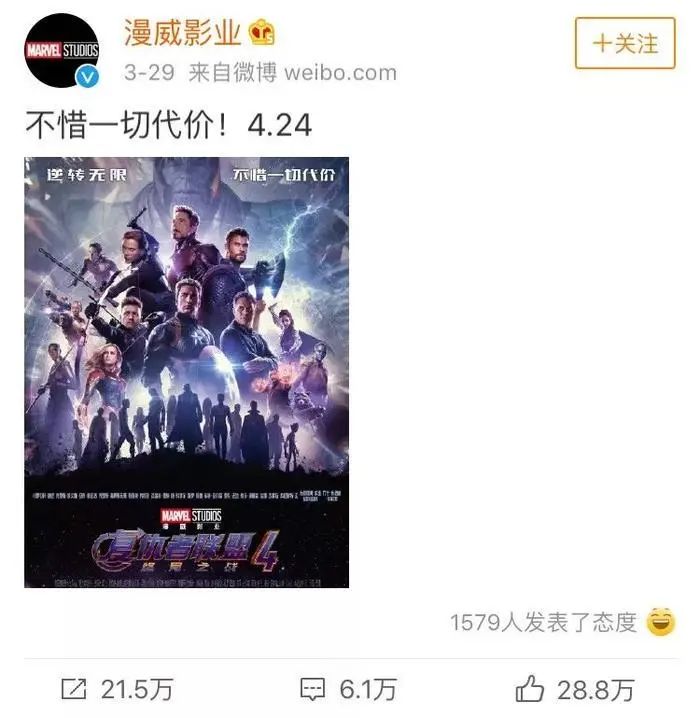 2019年3月29日,漫威影业官方微博宣布《复联4》将于4月24日在内地全球首映,提前北美两天公映——用给中国影迷的“特殊待遇”打响了营销宣传的第一枪。此条微博很快获得20万以上的转发量,#复联4首映#词条一度登上微博热搜第一。
