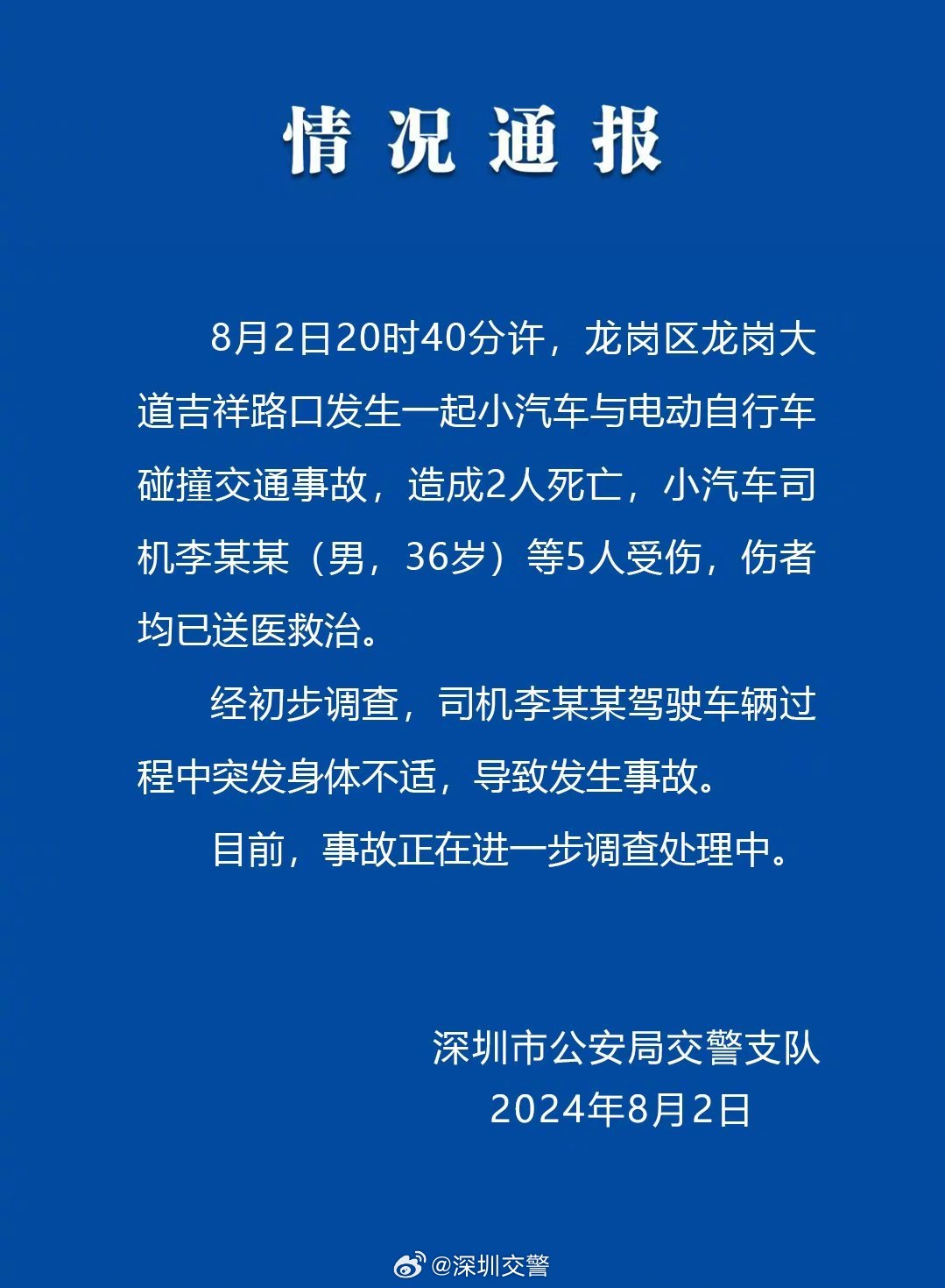 深圳市公安局交警支队发布情况通报:8月2日20时40分许,龙岗区龙岗大道吉祥路口发生一起小汽车与电动自行车碰撞交通事故,造成2人死亡,小汽车司机李某某(男,36岁)等5人受伤,伤者均已送医救治。经初步调查,司机李某某驾驶车辆过程中突发身体不适,导致发生事故。目前,事故正在进一步调查处理中。