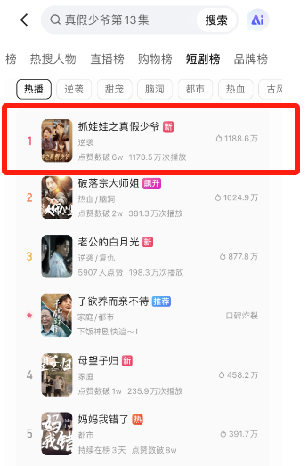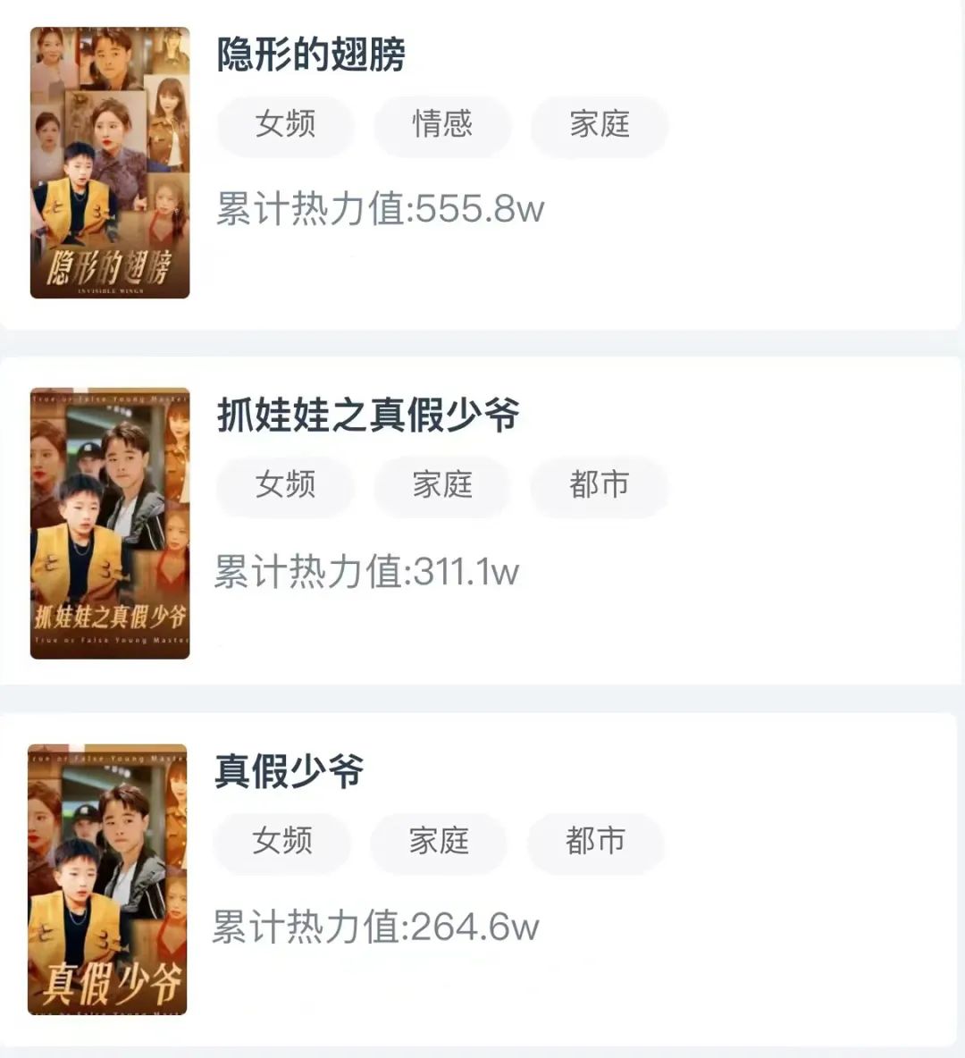 同时,《隐形的翅膀》(又名《真假少爷》)在抖音和快手上热度不低,在快手上更是获得了空降榜一的成绩。