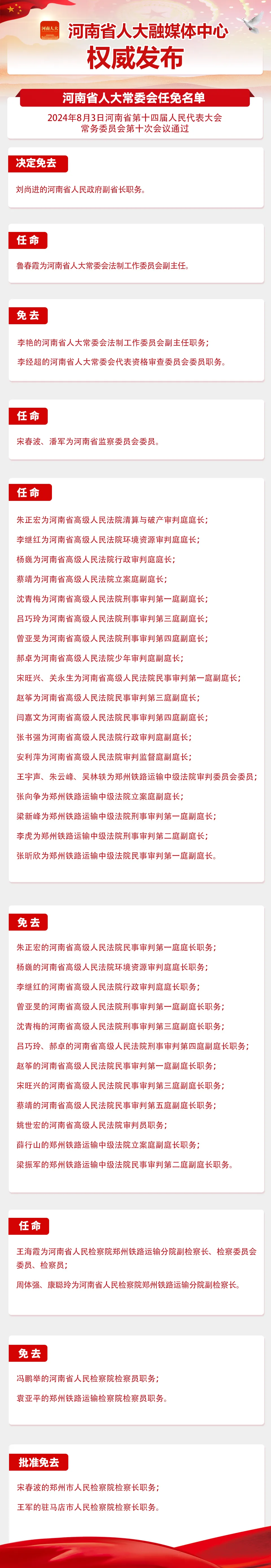 8月3日,据“河南发布”微信公众号消息,河南省第十四届人大常委会第十次会议任免名单发布,其中刘尚进被免去河南省副省长职务。具体名单如下: