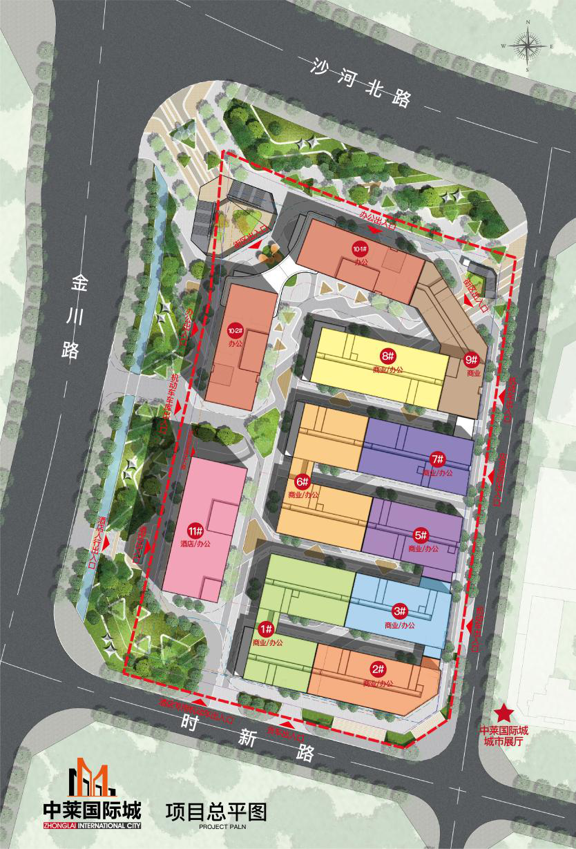 中莱国际城位于金川路与沙河北路交叉口(云南阜外医院正对面),总占地50亩,建筑面积超10万方,项目包含五大业态板块:大市场产权铺、地下市集、LOFT公寓、花园办公、品牌酒店。