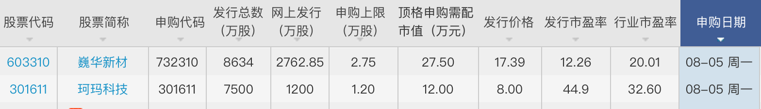 8月5日周一,打新者可申购的是创业板公司珂玛科技(301611.SZ)以及沪市主板的巍华新材(603310.SH)。