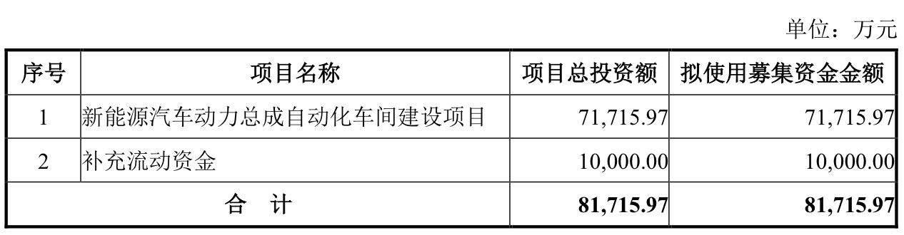 那么这一次,英搏尔计划募资的8.1716亿元,将投入到“新能源汽车动力总成自动化车间建设项目”7.17亿元,剩下的补充流动资金。