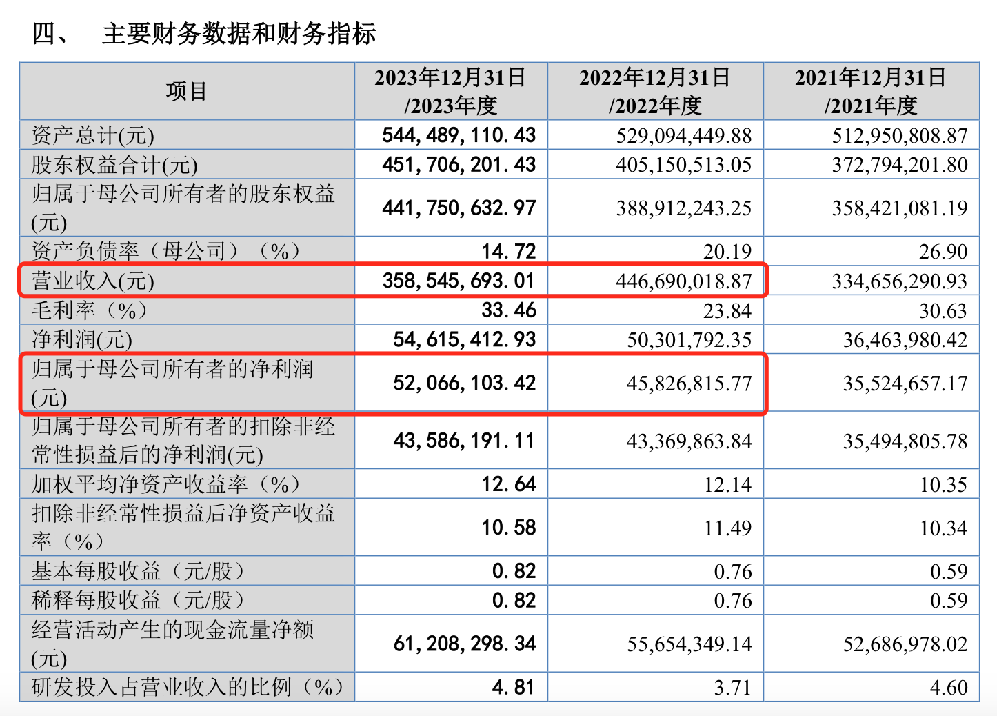 数据显示,科力股份的2023年营业收入3.59亿元,净利润5206.61万元。不过需要指出的是,同比2022年,科力股份的营业收入和净利润同比双降。
