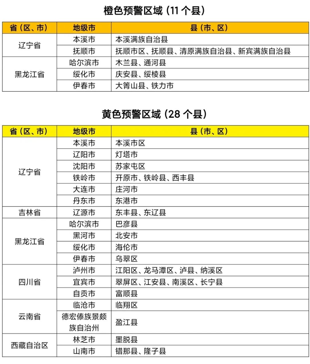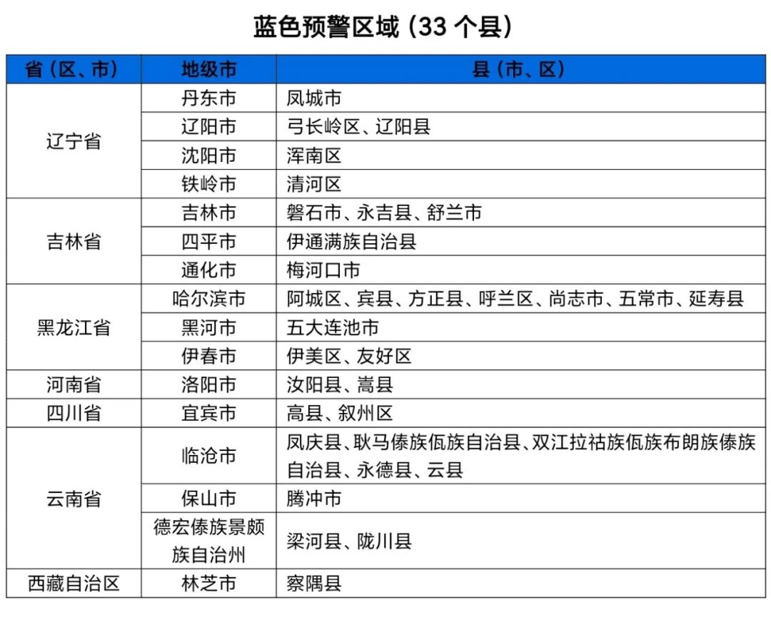 预计,8月4日20时至8月5日20时,辽宁南部和东部、吉林南部、黑龙江中部、四川东南部、云南西部、西藏东南部等地部分地区发生山洪灾害可能性较大(黄色预警),其中,辽宁东部、黑龙江中部局地发生山洪灾害可能性大(橙色预警),预警区域涉及的县(市、区)见下表。其他地区也可能因局地短历时强降水引发山洪灾害,请各地注意做好实时监测、防汛预警和转移避险等防范工作。