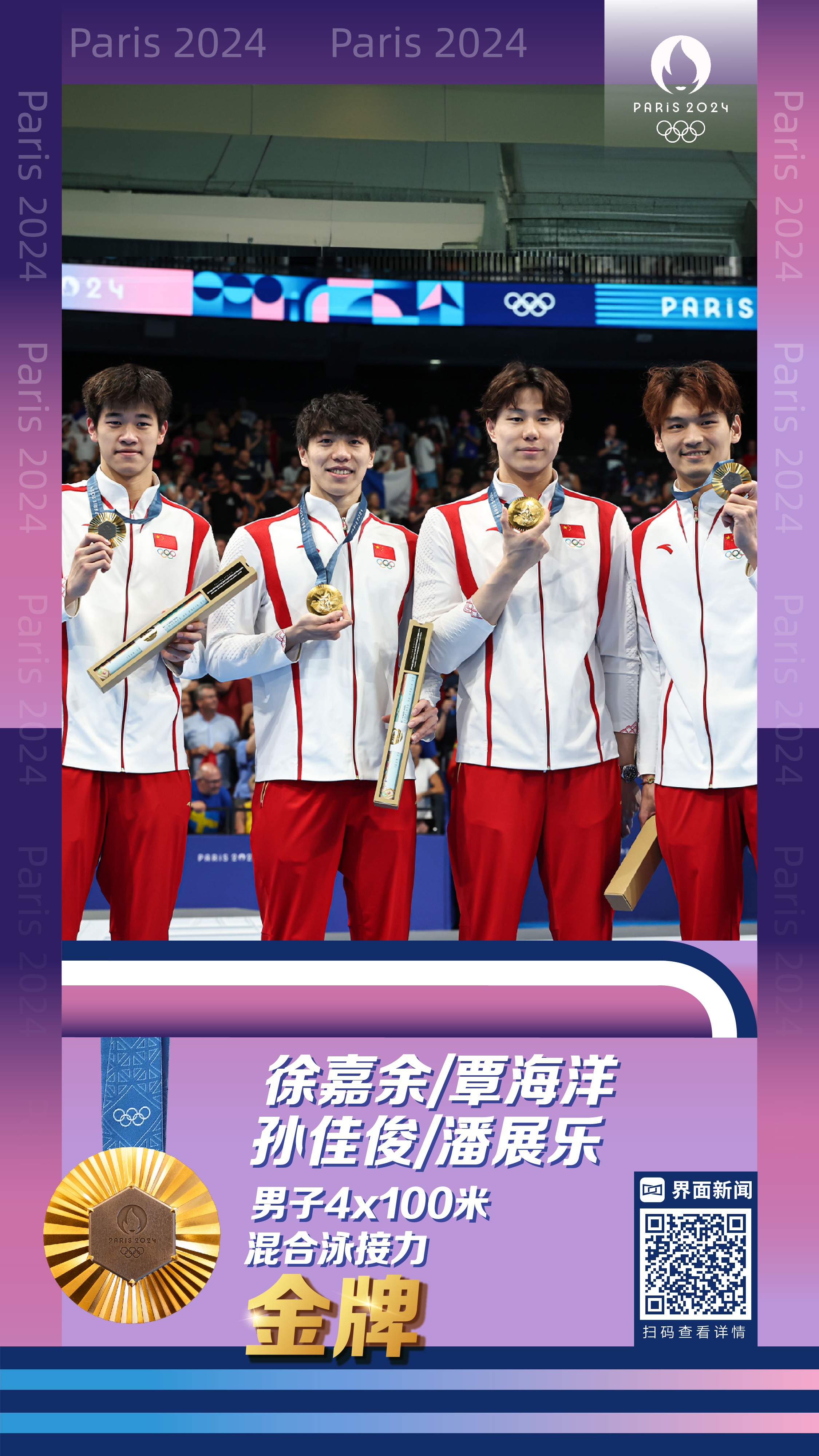 北京时间8月5日,在巴黎奥运会游泳男子4×100米混合泳接力决赛中,中国队夺得金牌。这是中国代表团在本届奥运会上获得的第19枚金牌。
