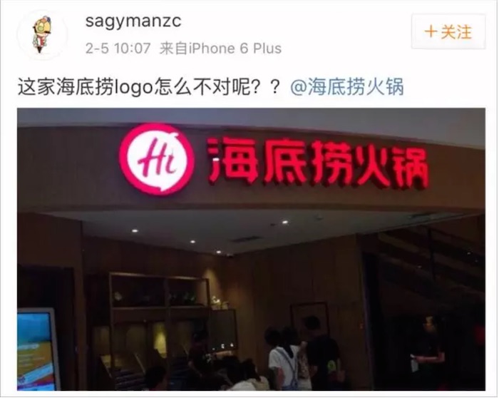 上个月,有网友发微博并@海底捞火锅,表示“这家海底捞的logo怎么不对呢”,感觉好像去的是假的海底捞。