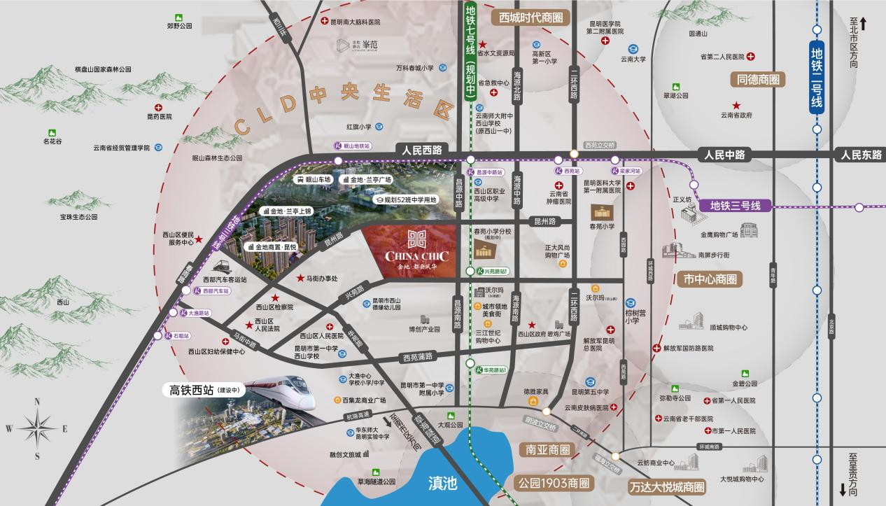 可以说,金地·都会风华刚好位于两个TOP级城市资源圈的交叉点,处于两者正中间的位置,与两边的距离相当,能够同时享受到昆明西客站TOD和市中心商圈双边城市资源的辐射。