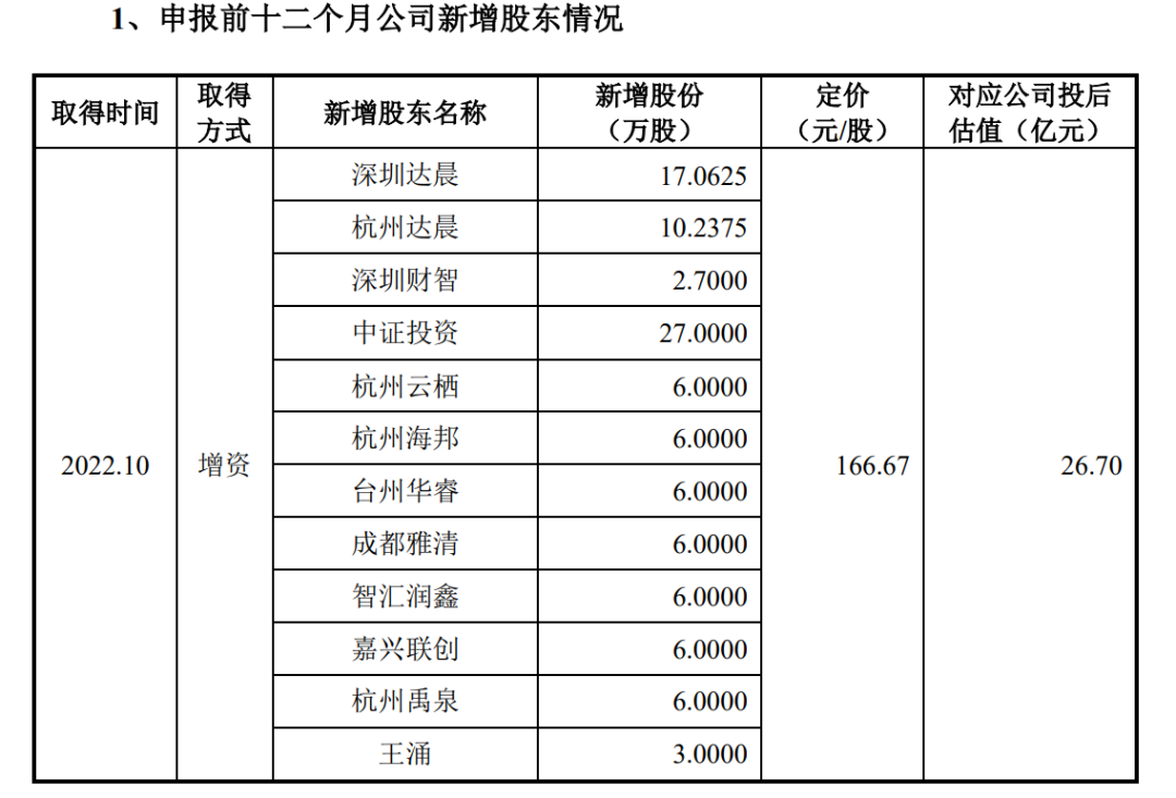 招股书显示,在2022 年 10 月,思看科技以投前估值 25 亿元进行 B 轮融资,深圳达晨、杭州达晨、深圳财智、中证投资、杭州海邦、银杏谷资本等12家投资机构均以166.67元/股的价格对思看科技进行了增资,合计增资1.7亿元,对应公司的投后估值为26.7亿元。