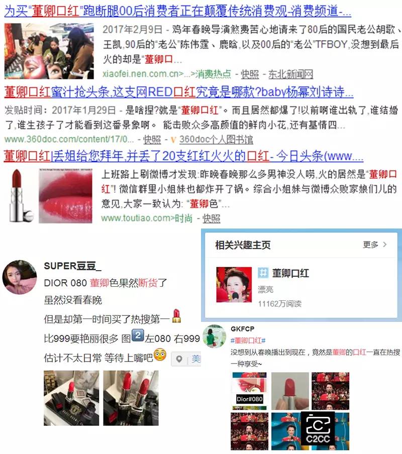 以董卿色为例,谁也没想到春晚最火的会是Dior#080口红,微博上关于#董卿口红#的话题阅读量已飙至11162万,“这是新的广告方式吗?”不少网友产生了这样的质疑。或许这就是赤裸裸的广告!随着话题热度的上升,那些整晚都在get同款唇膏的口红控们,终如久旱逢甘霖般迎来了各大营销号的扒色号行动,微博微信豆瓣上试色帖不断刷屏,无论如COSMO、时尚芭莎之类的时尚媒体,如新浪、凤凰等财经媒体也都纷纷跟进,终端断货消息不断传来……而后由娜塔莉·波特曼演绎的Dior迪奥烈艳蓝金唇膏广告潜入网络,更多色号如#999、#047、#060等又被相继曝出。在KOL成为“种草”收割机的后传播时代,也难怪限量版、断货王会不断涌现。
