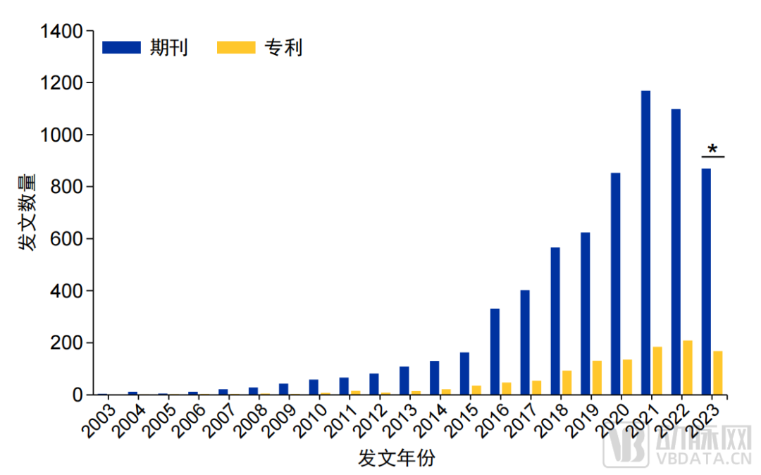 2003—2023年期间,生物墨水领域每年期刊发文数量和专利出版物数量,图源:《2024年未来健康:新兴生物材料》报告