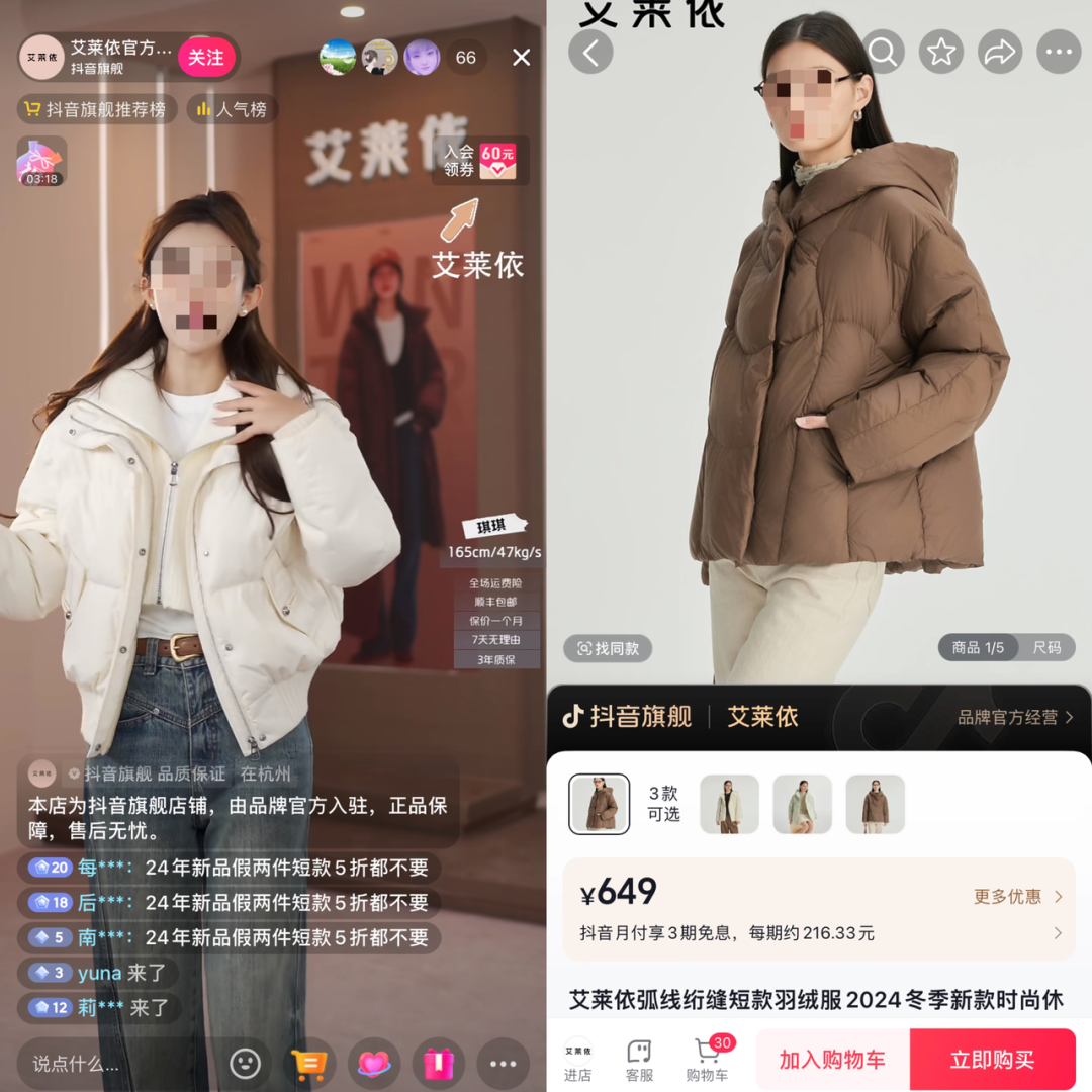 鸭鸭集团品牌负责人刘永熙就曾提到,品牌会有大约10%的老款货品,在反季时以更低的价格进行清仓。有大促时品牌也愿意为直播间增加投放推广,并在直播间里提供一些额外福利来吸引消费者。鸭鸭本身价格亲民,当季新款一般在600至800元,反季时老款打折后一般是299元、399元价格,整体性价比高。