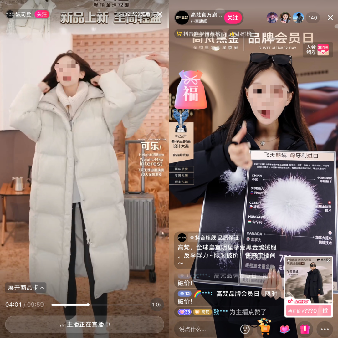 走高端路线的品牌,反季打折卖老款也会很受欢迎。因为品牌本身建立了较强认可度和知名度,消费者反季购买折扣款就会更有“捡漏”的快感。比如波司登在李佳琦反季专场中的一款短款羽绒服只要599元,品牌自己的抖音直播间里也会有打折至700元上下的款式。还有定位为高奢的品牌高梵,当季羽绒服价格都在四位数,甚至高端款要达到上万元。近期品牌也与小小莎等头部达人合作做反季专场,三位数的折扣款就很有吸引力。