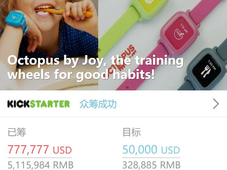 Octopus 在 Kickstarter 上线以来,获得 6,954 人支持,共筹得 5,115,984 RMB,目标达成率 245%,现在已经众筹成功。另外还在 Indiegogo 众筹成功过,吸金达 257 万元,总筹资高达 768 万。