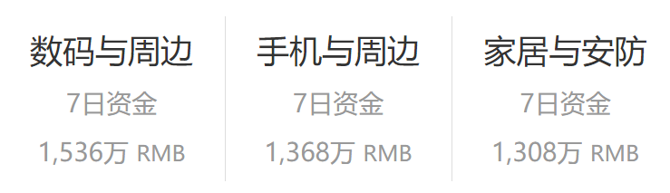 本周「数码与周边」资金引入量 1,536 万,相比上周增长 59.5%,好久不见的「手机与周边」本周筹得 1,368 万,居行业第二,上周榜首的「家居与安防」本周筹得 1,308 万,比上周下跌 35.9%,本周居行业第三。