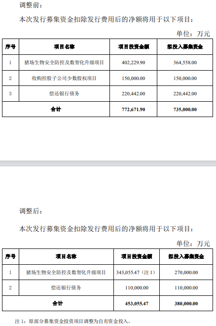 为何定增募资上限大幅下滑48.3%。界面新闻了解到,最新定增方案中,新希望删除了原计划使用15亿元募资“收购控股子公司少数股权项目”,并将“猪场生物安全防控及数智化升级项目”拟使用的募资从36.46亿元下调至27亿元,将拟用于“偿还银行债务”的募资从22.04亿元减少至11亿元。