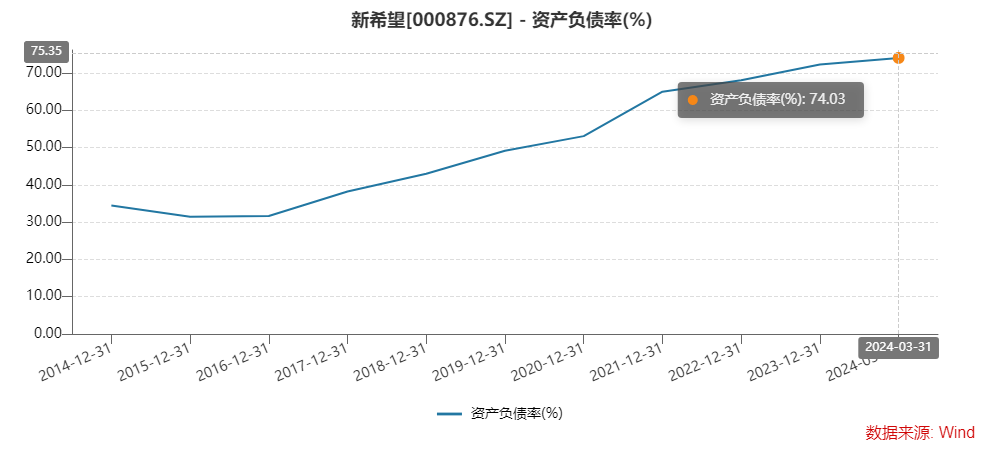 2020年以来,新希望未进行现金分红。Wind数据显示,2021年至2023年及2024年一季度,新希望的资产负债率分别是64.98%、68.02%、72.28%及74.03%。整体来看,该公司上市以来累计直接募资394.51亿元(含定增募资146.43亿元、发债融资121.9亿元),实现净利润167.49亿元,累计现金分红62.97亿元,上市以来平均分红率37.6%。