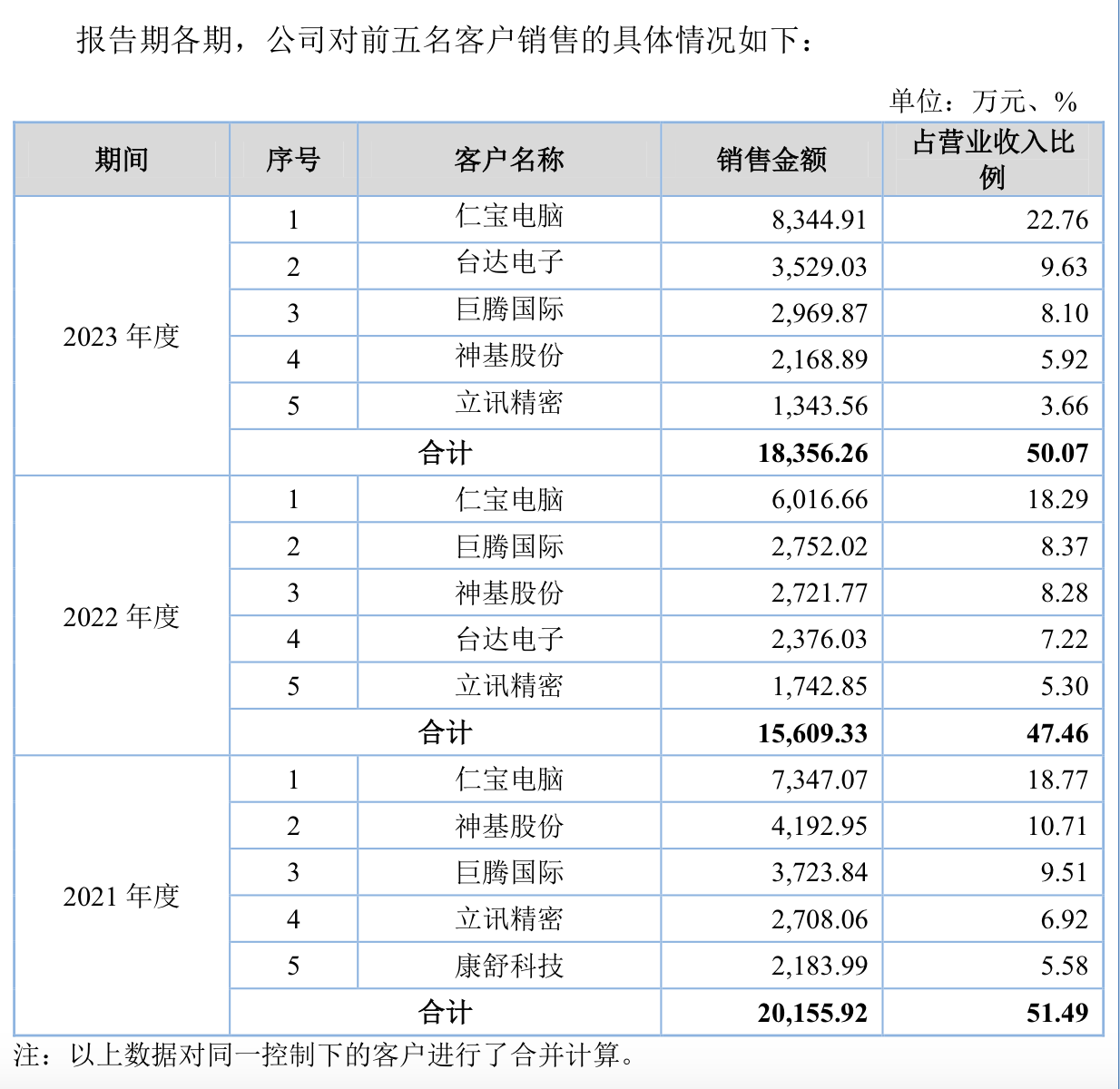 说明书显示,受下游品牌集中度较高、客户对供应链集中管理等因素的影响,产业链呈现集中化的特征。按同一集团控制下的客户合并计算,2021年度、2022年度和2023年度,鼎佳精密前五大客户的合计销售收入分别为20155.92万元、15609.33万元和18356.26万元,占营业收入的比重分别为51.49%、47.46%和50.07%,客户集中度较高。
