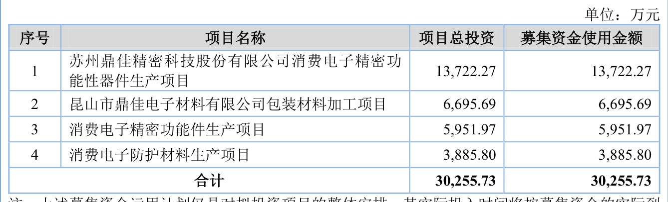 此次,鼎佳精密计划募资3.03亿元,其中“苏州鼎佳精密科技股份有限公司消费电子精密功能性器件生产项目”投入1.37亿元,“昆山市鼎佳电子材料有限公司包装材料加工项目”投入6695.69万元,“消费电子精密功能件生产项目”投入5951.97万元,“消费电子防护材料生产项目”投入3885.8万元。