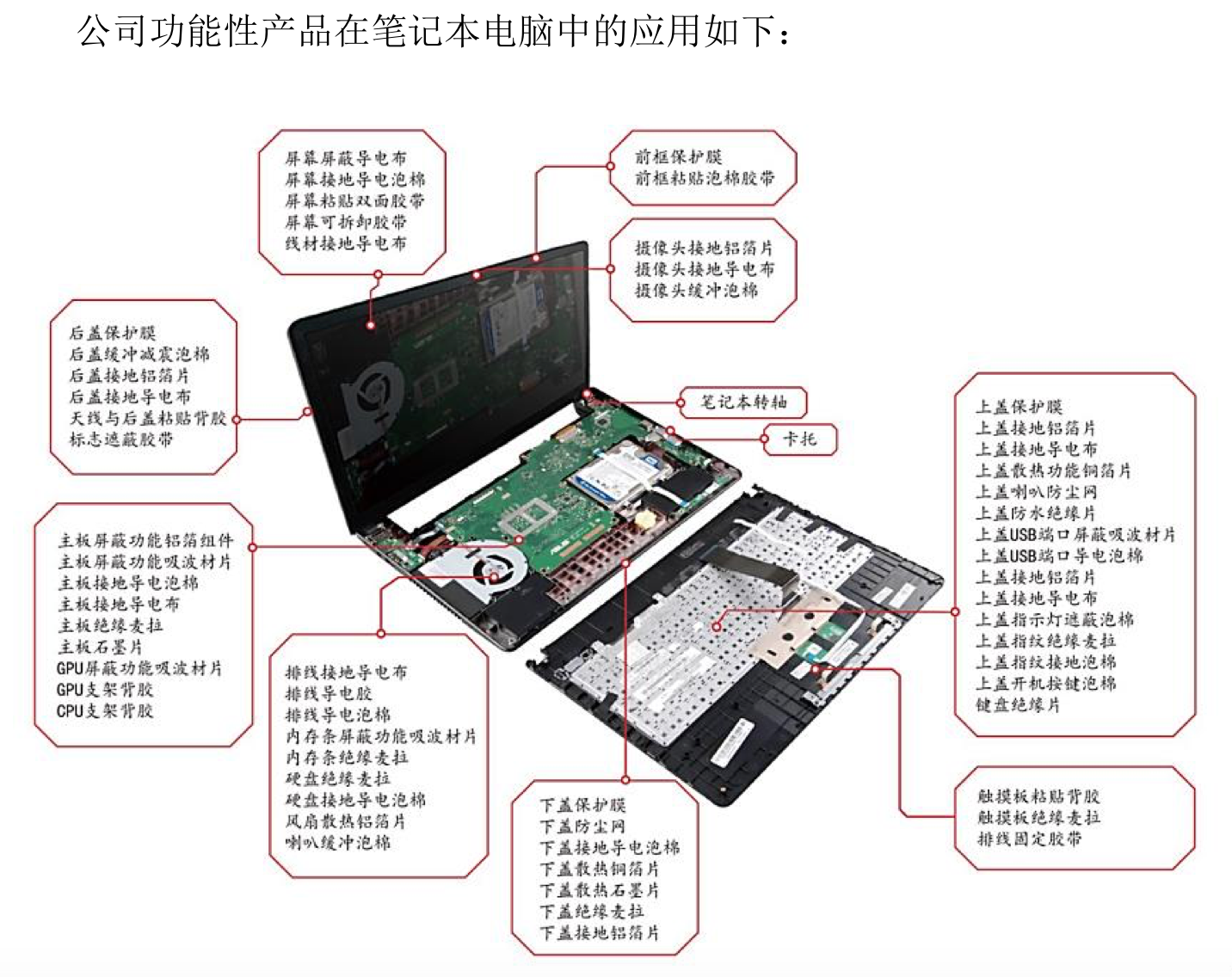 据悉,鼎佳精密主营消费电子功能性产品及防护性产品,产品可应用于笔记本电脑、平板电脑、智能手机、一体电脑、服务器、显示器、AR/VR、智能游戏机等消费电子产品。功能性产品主要应用在消费电子产品内部,起到电磁屏蔽、粘贴、缓冲、防尘透气等作用;防护性产品可对在生产或储运过程中的消费电子产品或组件起到包装、抗压、缓冲、稳固等作用。与此同时,公司也对新应用领域进行开拓,相关产品已应用于动力电池、新能源热管理系统等汽车领域。