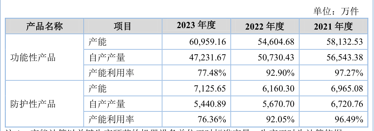 不过界面新闻注意到,鼎佳精密无论是功能性产品还是防护性产品,报告期内的产能利用率都在走跌。其功能性产品2021年至2023年的产能利用率分别为97.27%、92.9%、77.48%;防护性产品2021年至2023年的产能利用率分别为96.49%、92.05%、76.36%。