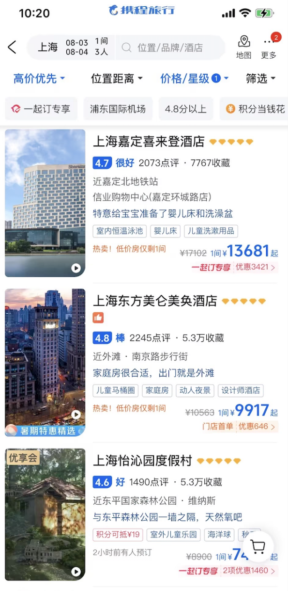 在魔都上海,一边是11元起的上海美租青年公寓,另一边是28000元起的小娅家的民宿。作为国际大都市,上海奢华酒店数量众多且风格多样,顾客的选择也不局限于几家。暑期期间,其预订量受到国内外游客的青睐,特别是希望享受高端服务和购物体验的游客。