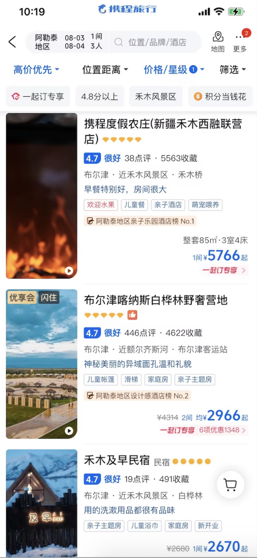 在金山之城阿勒泰,作为2024年暑期增长最快的旅游目的地,当地也暂没有国际奢华酒店品牌入驻。从周六21点45分当日预订情况来看,携程度假农庄(新疆禾木西融联营店) 可售房型5766元起、可可托海吉域合涵田酒店998元起,两者算是抢到了当地第一口蛋糕。