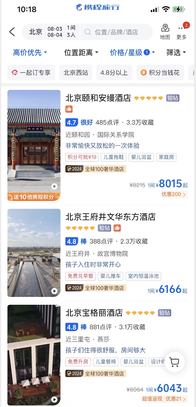 从周六21点当日预订情况来看,奢华酒店品牌整体房价较为稳定。北京王府井文华东方酒店6166元起、北京宝格丽酒店6043元起、北京颐和安缦酒店5208元起、北京东方君悦大酒店5014元起,这些酒店都没有全部预订出去,整体来看还是“曲高和寡”。
