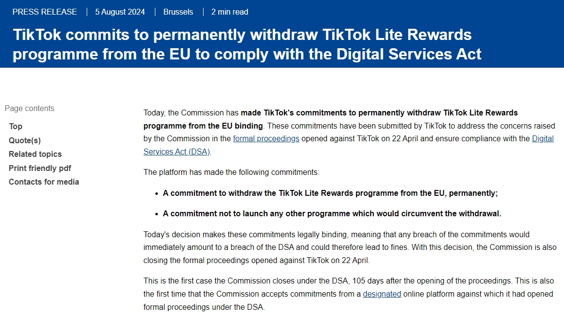欧盟委员会8月5日宣布,TikTok已承诺从欧盟市场永久撤出TikTok Lite奖励计划,以解决欧委会在4月22日提起的正式诉讼中提出的问题,并确保遵守《数字服务法案》(DSA)。TikTok承诺从欧盟永久撤出TikTok Lite奖励计划,且不会推出任何规避撤出的其他计划。欧委会称,未来任何违反承诺的行为都将立即构成违反DSA的行为,可能导致罚款。通过上述决定,欧委会结束了4月对TikTok提起的正式诉讼,而这也是欧盟《数字服务法案》下首个了结的案子。