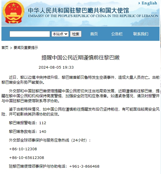 中国驻黎巴嫩大使馆8月5日发布公告,提醒中国公民近期谨慎前往黎巴嫩:
