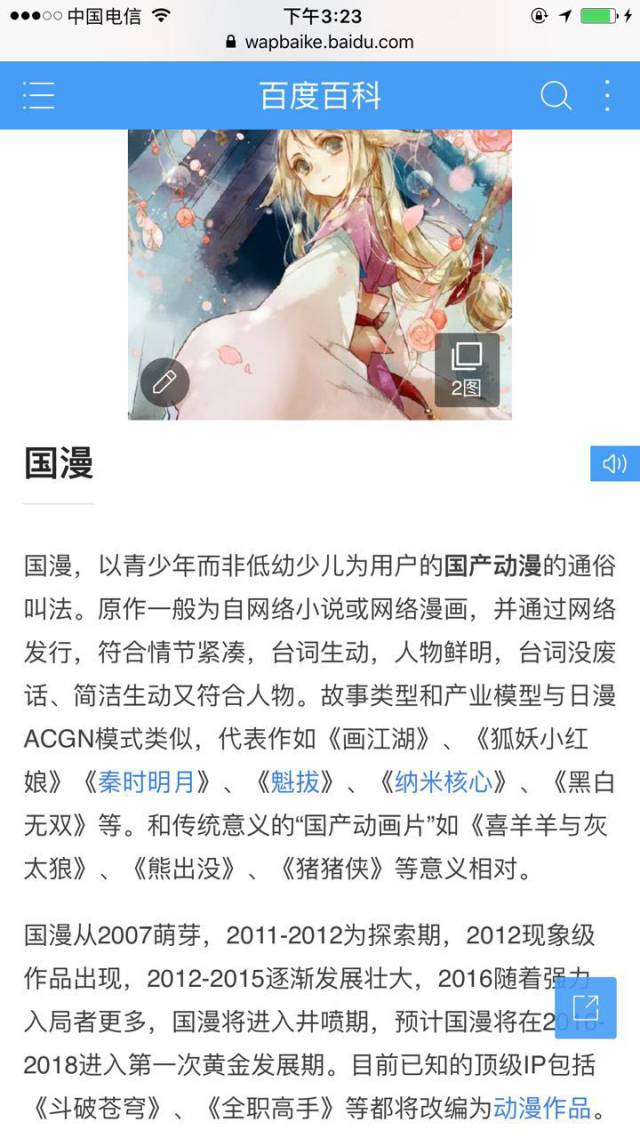 国漫是国产动漫的简称,和日本动漫相对而产生的称呼,其主要受众是青少年而非幼儿,是一个极具发展潜力的新兴行业。