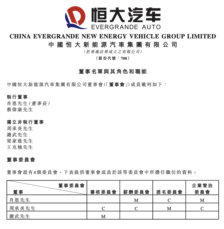 恒大汽车8月5日晚间在港交所公告,蔡伟康获委任为执行董事,梁家进获委任为独立非执行董事,及王克楠获委任为独立非执行董事,即时生效。刘永灼及秦立永被免去执行董事职务,即时生效。公司将就董事委员会的任何组成变动另行刊发公告。
