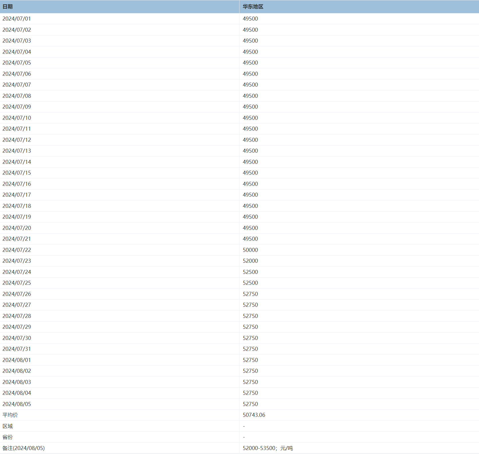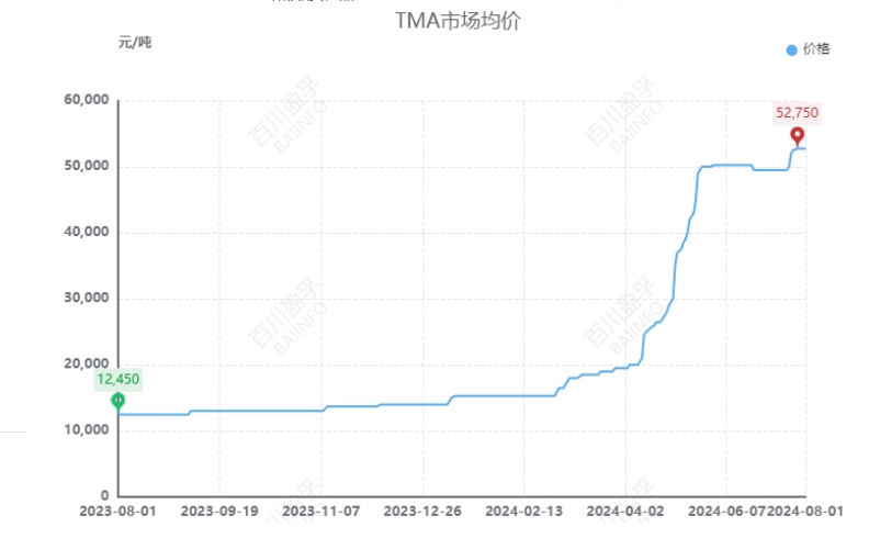 界面新闻发现,在英力士正式宣布停产TMA后不久,国内的TMA市场报价就飞速上涨,从大约2万元/吨2个月内飙升至5万元/吨。并在5万元/吨的价位盘整了2个月左右后再度跳涨至52750元/吨。根据百川盈孚提示:“8月5日,华东地区TMA市场高位整理。主力工厂报盘延续高位,据了解,今日国内市场报价参考52000-53500元/吨左右,高价听闻仍存。场内现货供应偏紧,下游采购心态谨慎,买盘观望气氛浓郁,实单成交刚需为主,成交重心高位整理,预计短线TMA市场偏强整理运行。”