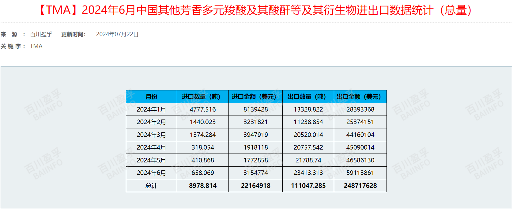 由于英力士的停产,国外TMA的缺口顿时放大。但通过计算中国其他芳香多元羧酸及其酸酐等及其衍生物的“出口金额/出口数量”可看到,截至今年6月,吨单价并没有相较于年初出现大幅上涨。