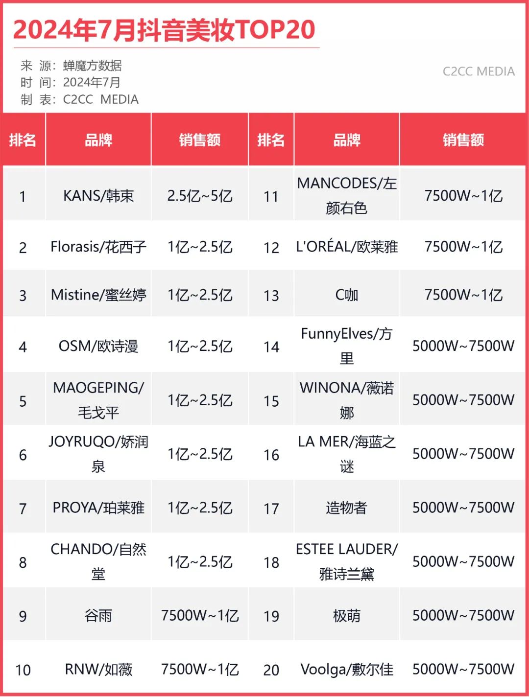 01 7月抖音美妆TOP20,国货品牌占据16席