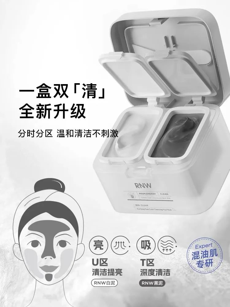 例如,RNW如薇双色泥膜T区使用黑色泥膜,吸附用酸疏通毛孔后松动的油脂黑头,深层清洁并抑制油脂分泌。而U区则使用白色泥膜,主要针对毛孔粗大、暗沉等问题,同时舒缓补水,收缩毛孔,提亮肤色。消费者也可以根据皮肤状态选择单用、混用,量肤定制。